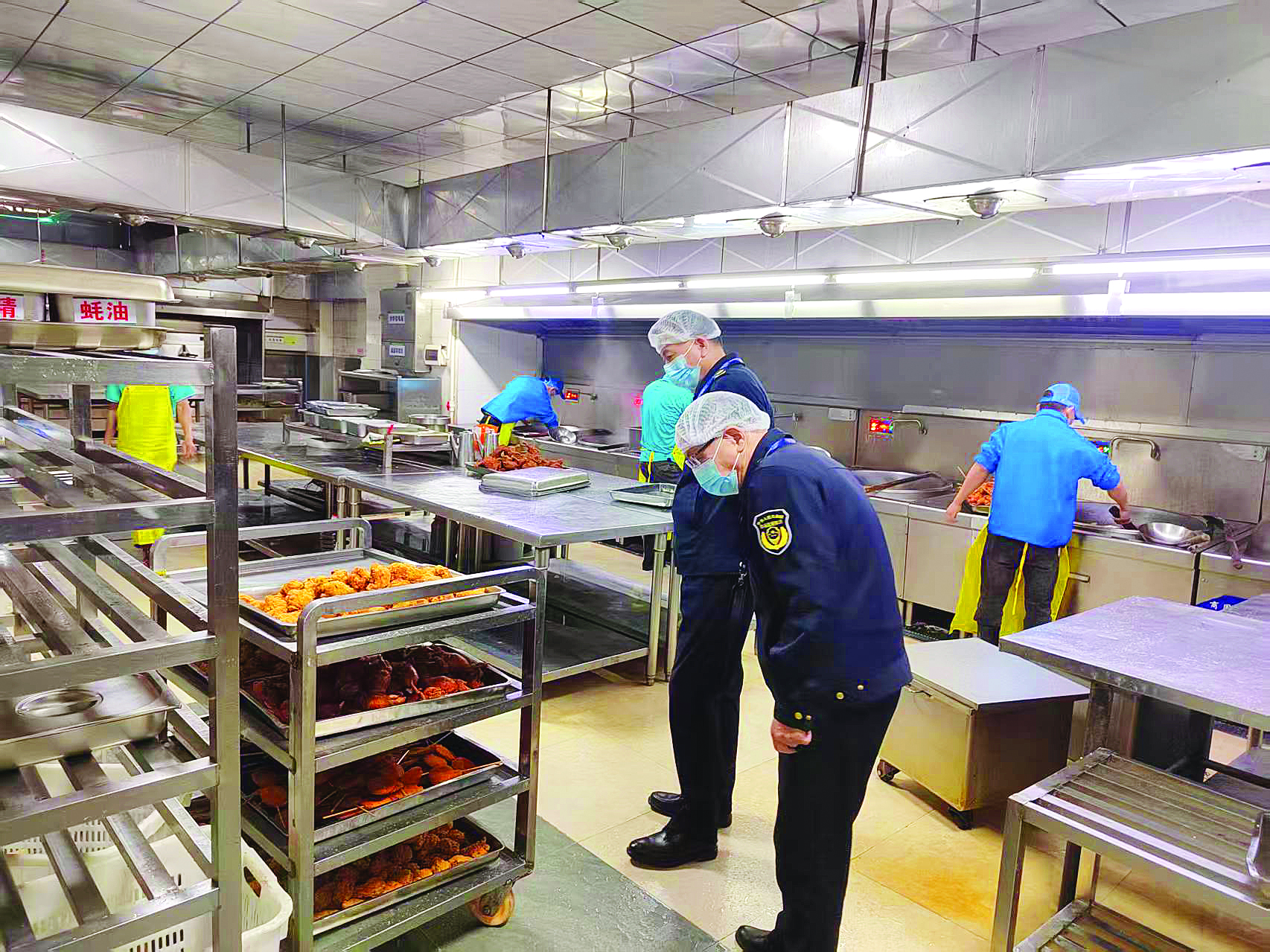 執(zhí)法人員在學(xué)校食堂檢查。