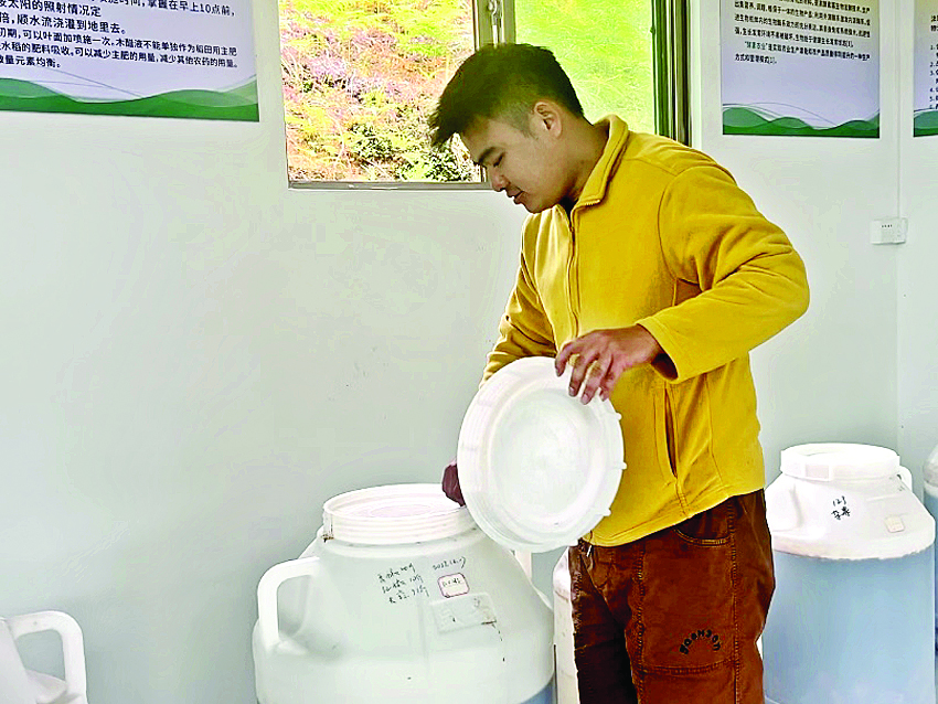 走進寶口鎮(zhèn)佐坑村的惠州市源尚水稻合作社,肥料倉庫內(nèi)整齊擺放著一桶桶標注好用料和時間的白罐。不同于以往的化肥和農(nóng)藥,掀開這些白罐的蓋子,一股股蔬果醬料的香氣撲鼻而來。