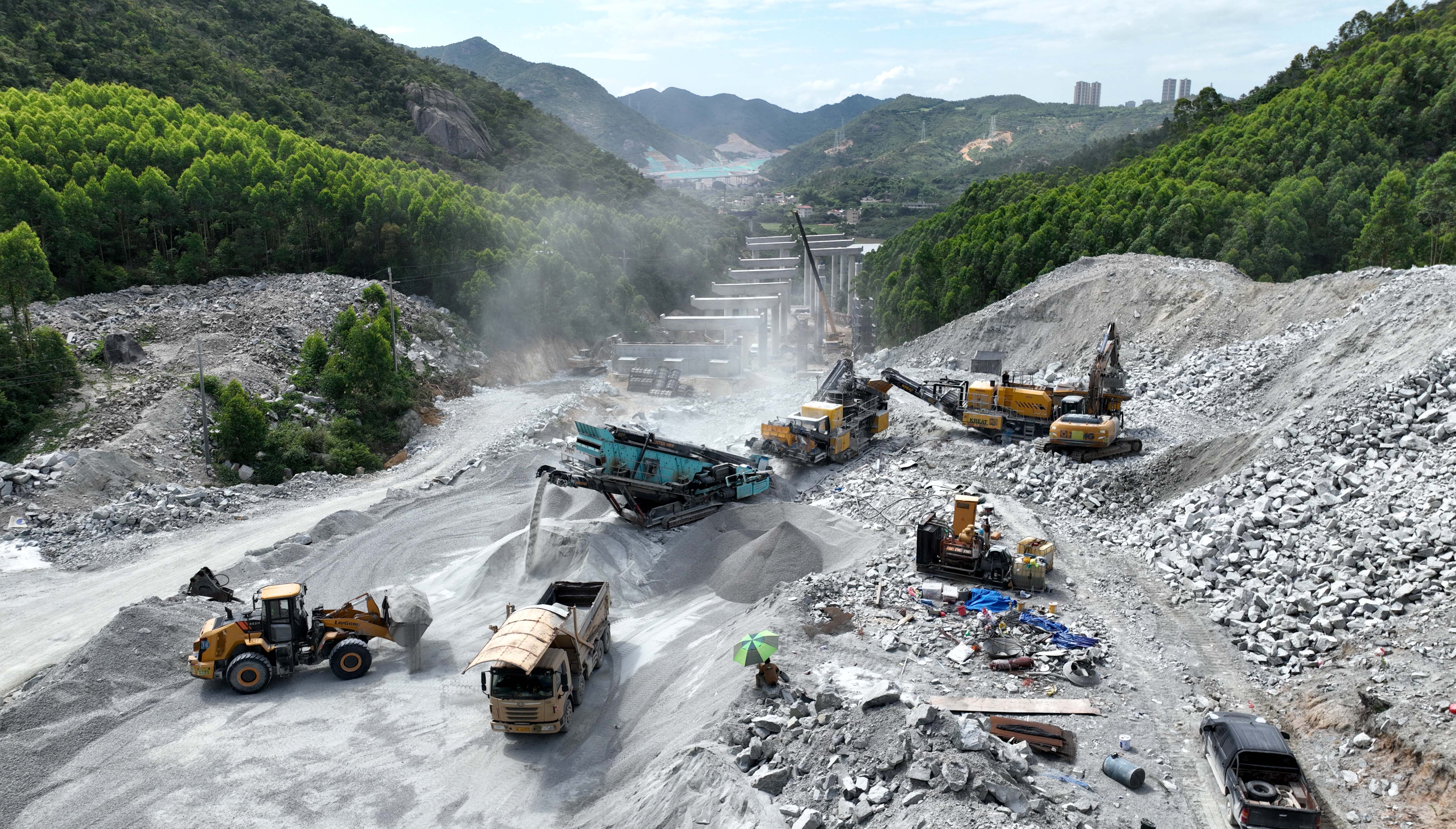 惠州稔平環(huán)島高速項(xiàng)目施工現(xiàn)場(chǎng),工程機(jī)械在緊張忙碌地開(kāi)展作業(yè)。