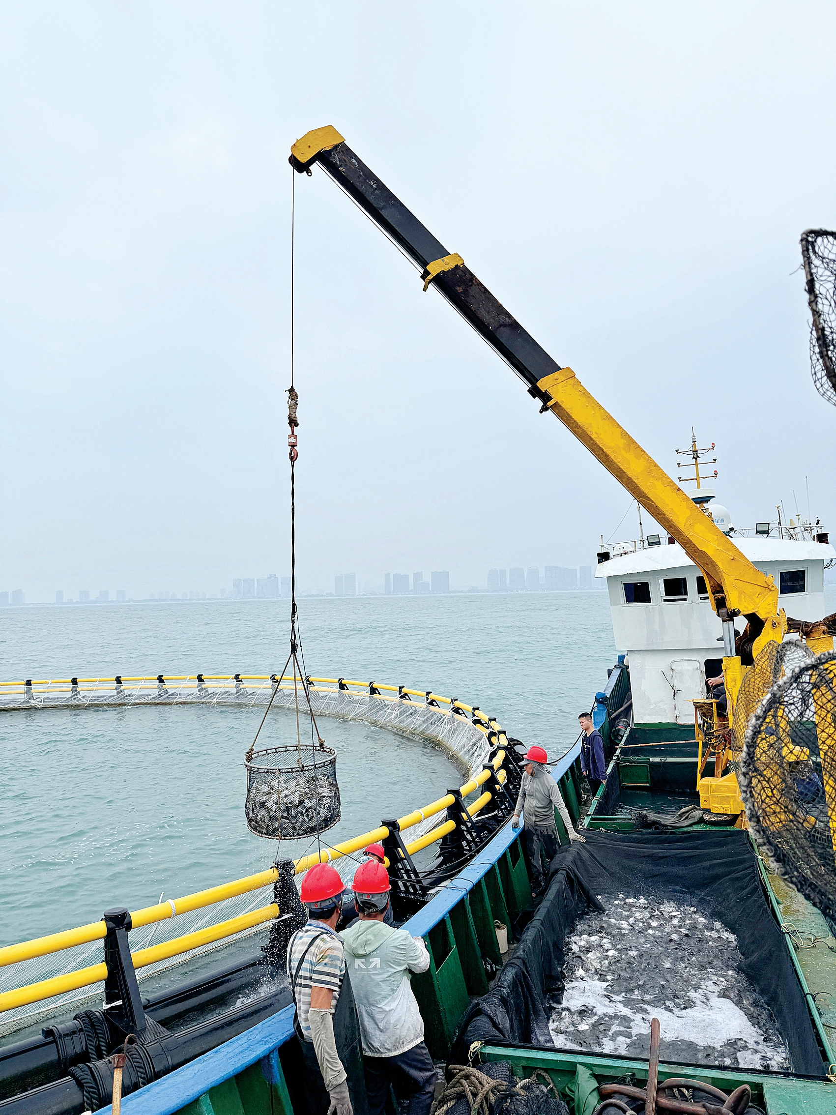 金鯧魚苗被投放入深海網(wǎng)箱。 圖片由市農(nóng)投集團(tuán)提供