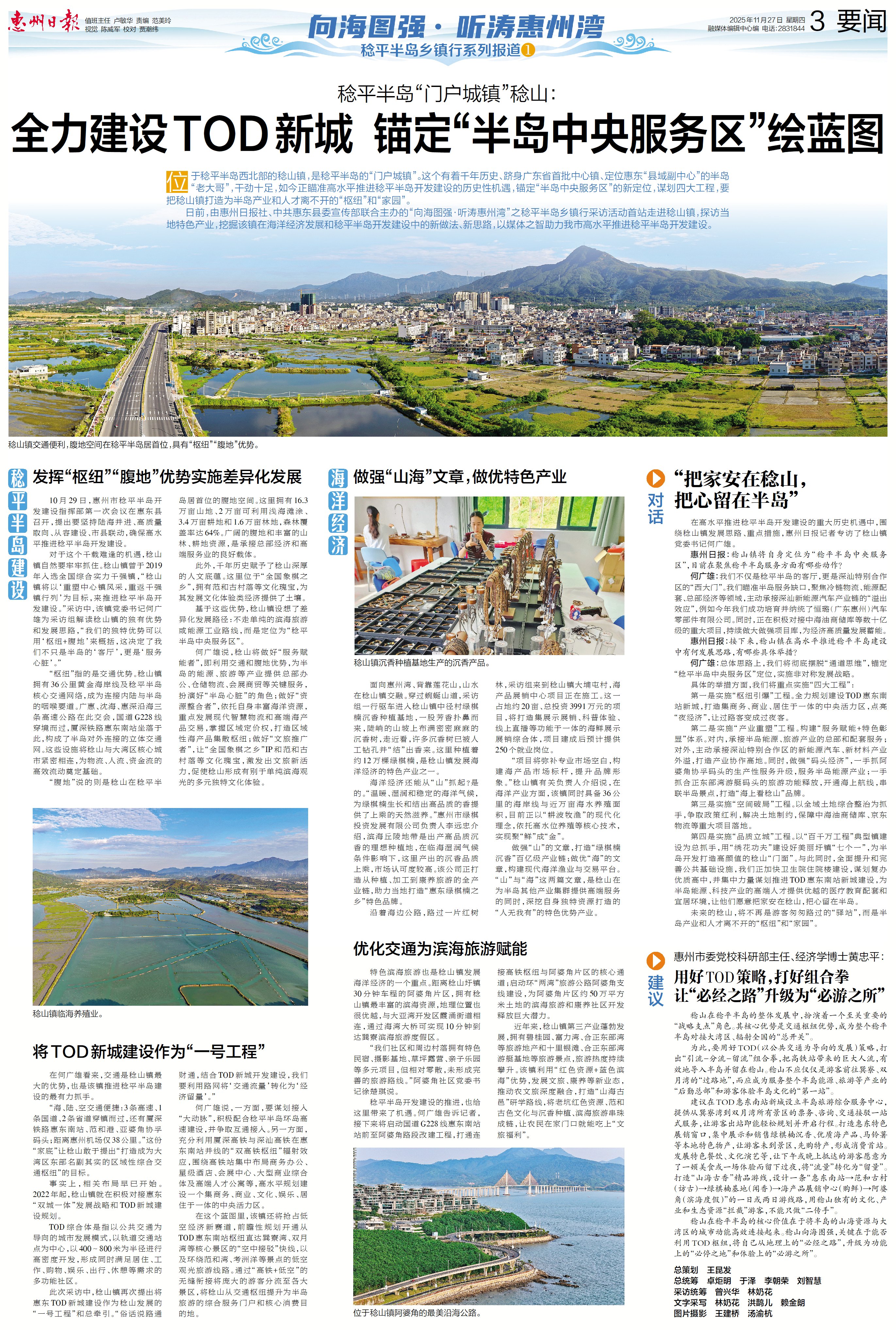 惠州日報訊 (記者林奶花 賴金朗)稔平半島是惠州大力發(fā)展海洋經(jīng)濟的主戰(zhàn)場、打造廣東高質(zhì)量發(fā)展新增長極的重大平臺。日前,“向海圖強·聽濤惠州灣”之稔平半島鄉(xiāng)鎮(zhèn)行采訪活動啟動,首站走進(jìn)稔山鎮(zhèn)。據(jù)悉,稔山鎮(zhèn)計劃錨定“稔平半島中央服務(wù)區(qū)”定位,并將惠東TOD新城建設(shè)作為稔山發(fā)展的“一號工程”和總牽引,利用路網(wǎng)將“交通流量”轉(zhuǎn)化為“經(jīng)濟留量”。