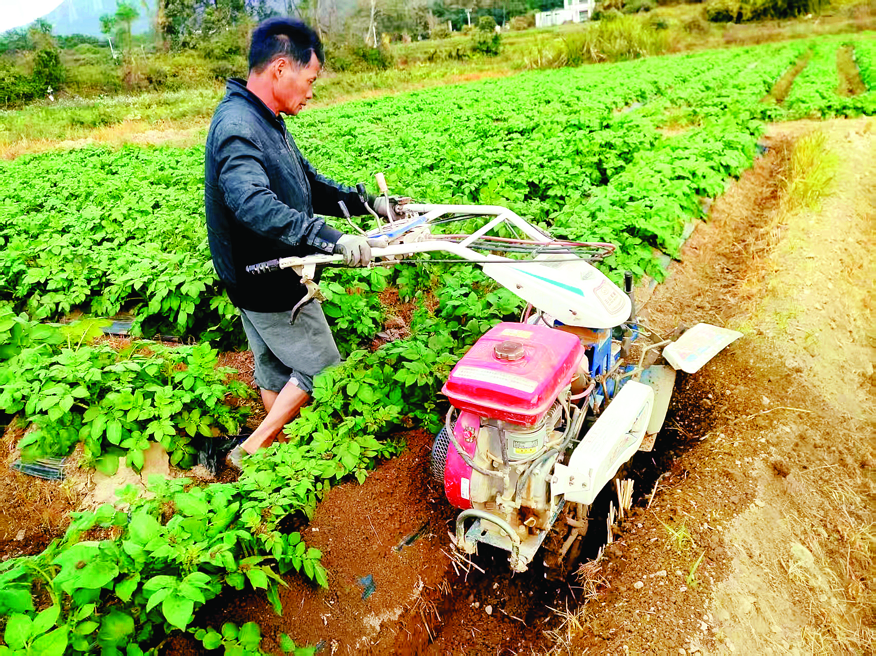 稔山鎮(zhèn)牛牯墩村村民用起壟機(jī)給馬鈴薯添土;葜萑?qǐng)?bào)記者賴金朗 攝