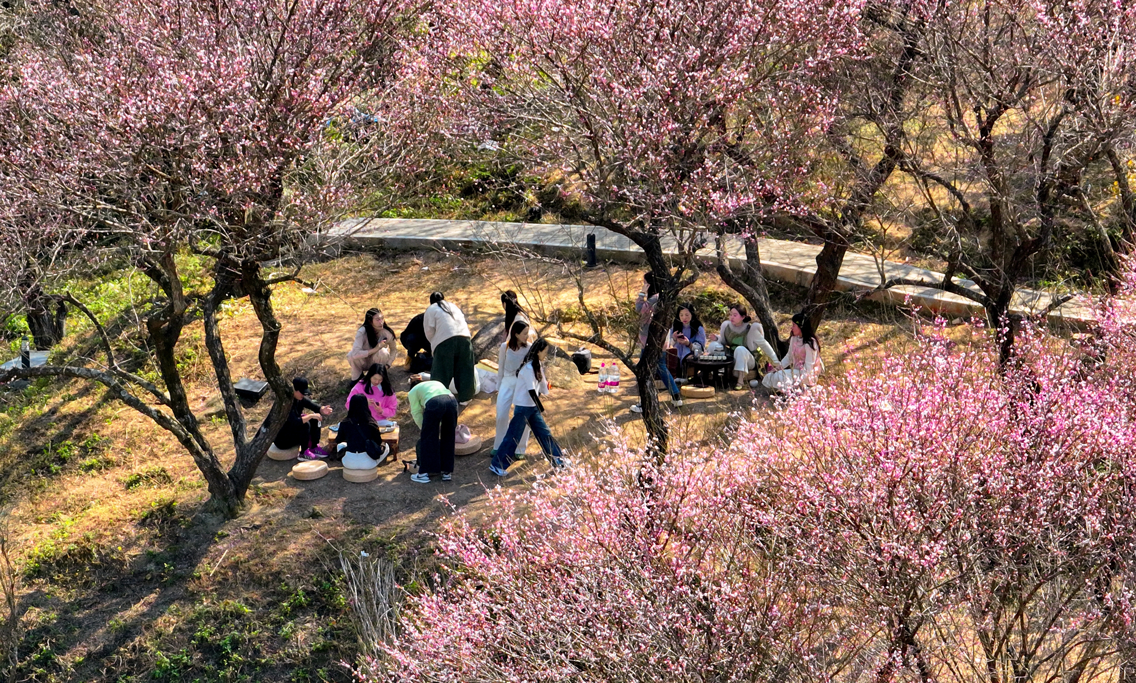 梅樹下,人們?nèi)宄扇,搬來桌凳,擺上水果點(diǎn)心,邊吃邊聊,悠閑賞梅。
