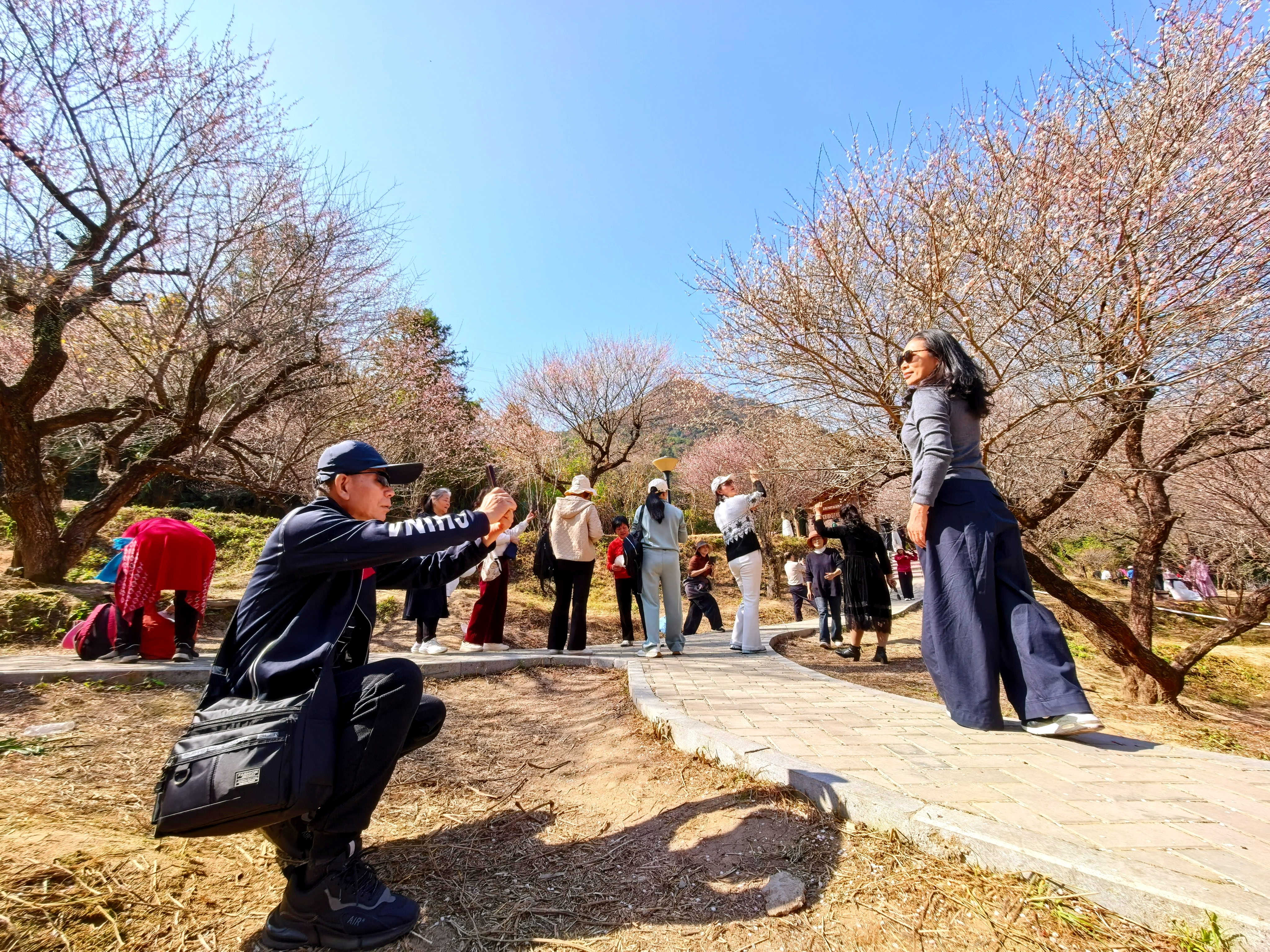 踏入梅園,清冷的空氣里滿是清甜的梅香。暖陽透過花枝,在石板路上灑下斑駁光影,將枝頭簇簇梅花映照得愈發(fā)靈動。蜜蜂與蝴蝶在花間自在穿梭,為這片靜謐的花海增添了幾分生機(jī)。梅樹下,游人三五成群,或搬來桌凳圍坐閑談,水果點(diǎn)心的香甜與梅香交織;或舉著相機(jī)認(rèn)真對焦,試圖定格梅花的雅致;更多人則在花下合影淺笑,將這份冬日“梅”好珍藏心間。花徑旁,即興的合唱與爽朗的歡笑不時響起,主播們舉著手機(jī)實(shí)時直播,把美景傳遞給遠(yuǎn)方的觀眾。