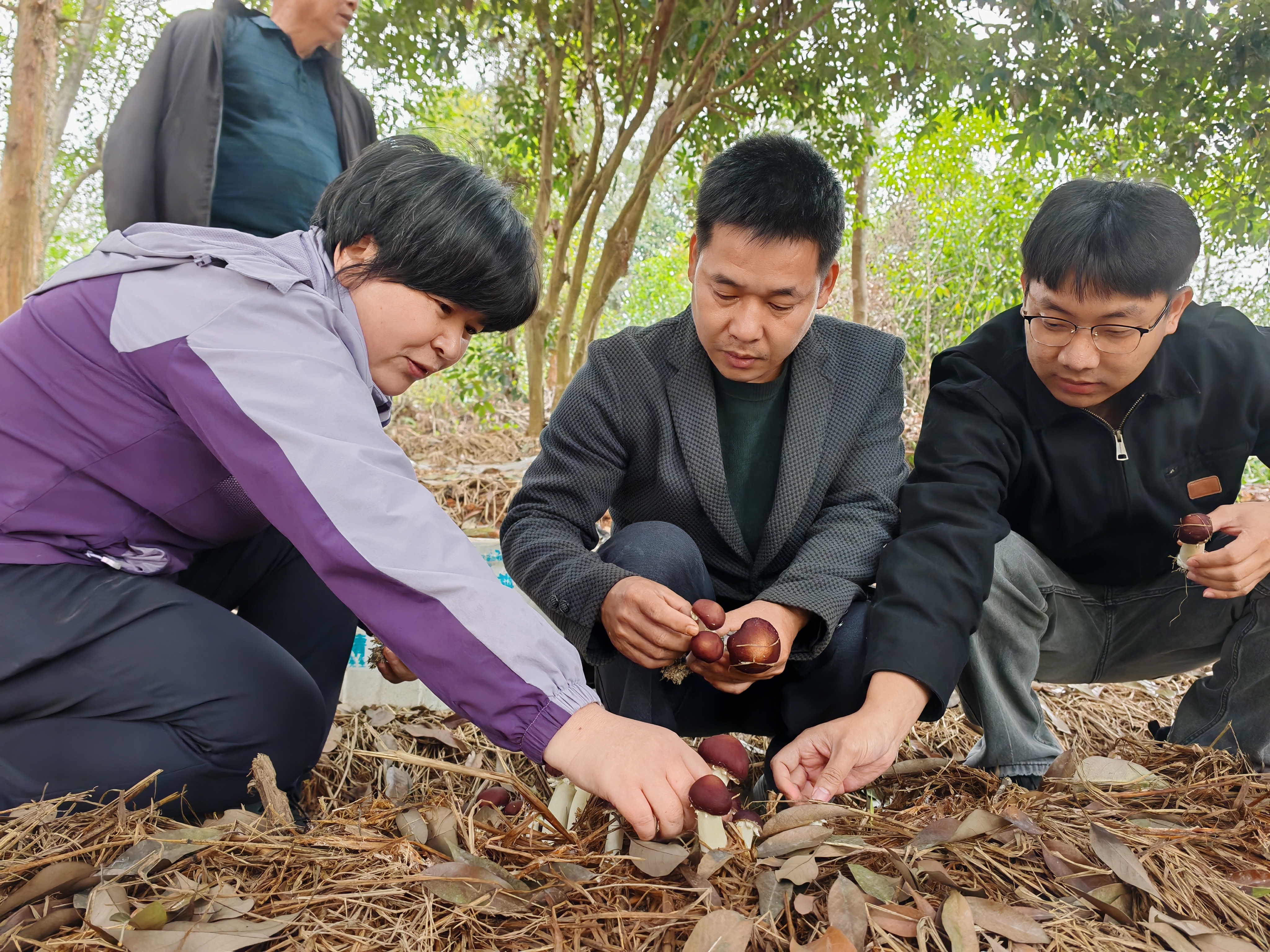惠州學(xué)院農(nóng)村科技特派員團(tuán)隊(duì)查看紅松茸長(zhǎng)勢(shì)。