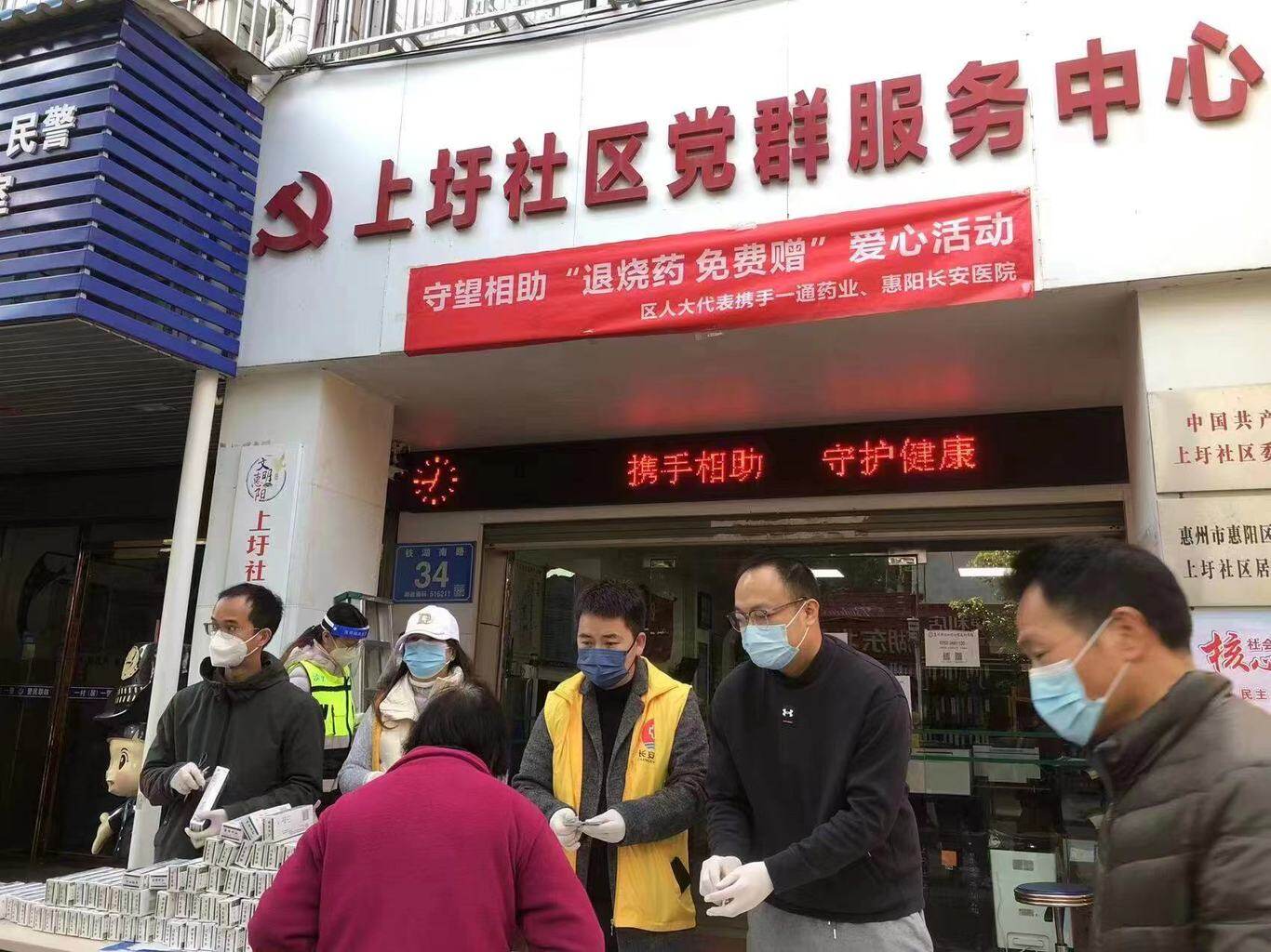 向社區(qū)居民免費(fèi)發(fā)放退燒藥。
