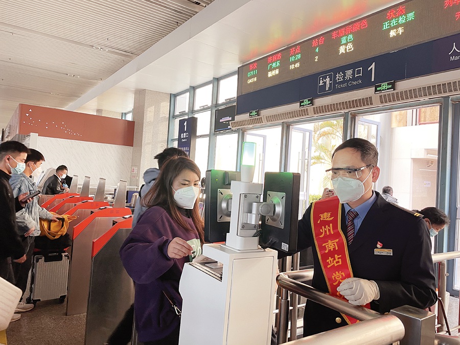 春運期間,惠州南站工作人員引導旅客通過自助檢票閘機。 惠州日報記者許文昌 通訊員劉綠平 攝