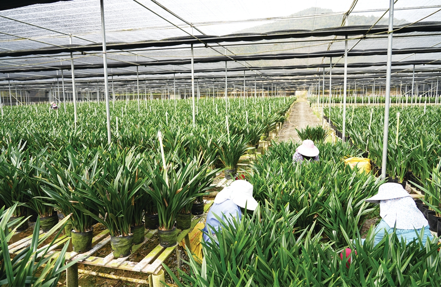 村民在蘭花基地忙碌。