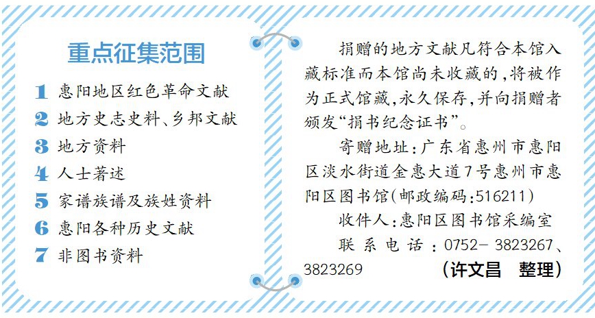 惠州日?qǐng)?bào)訊 (記者許文昌)日前,記者從惠陽區(qū)圖書館獲悉,為全面、系統(tǒng)收藏惠陽地方文獻(xiàn),進(jìn)行數(shù)字化建設(shè)并形成規(guī)模體系,惠陽區(qū)圖書館特面向社會(huì)各界長(zhǎng)期、廣泛征集各類地方文獻(xiàn)。