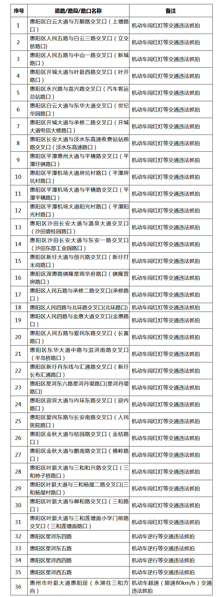 關(guān)于啟用惠陽區(qū)36個點(diǎn)位交通技術(shù)監(jiān)控設(shè)備的公告