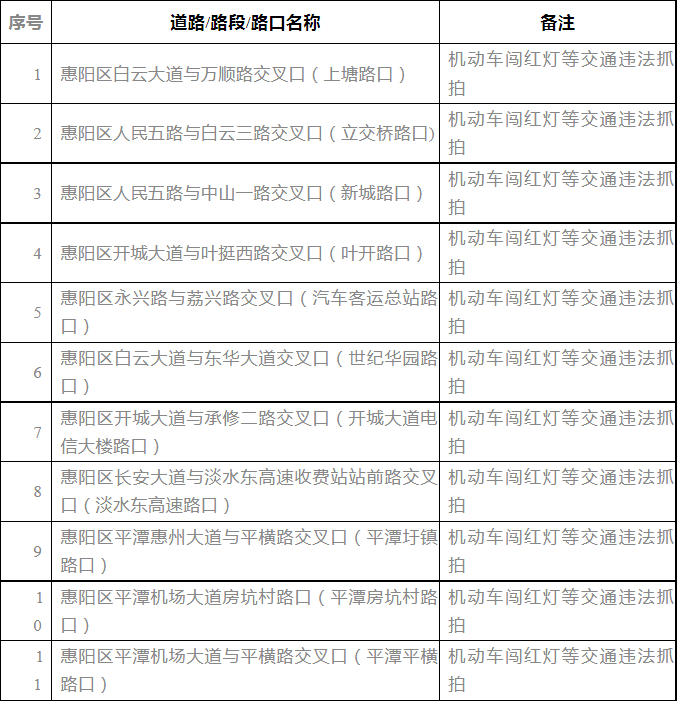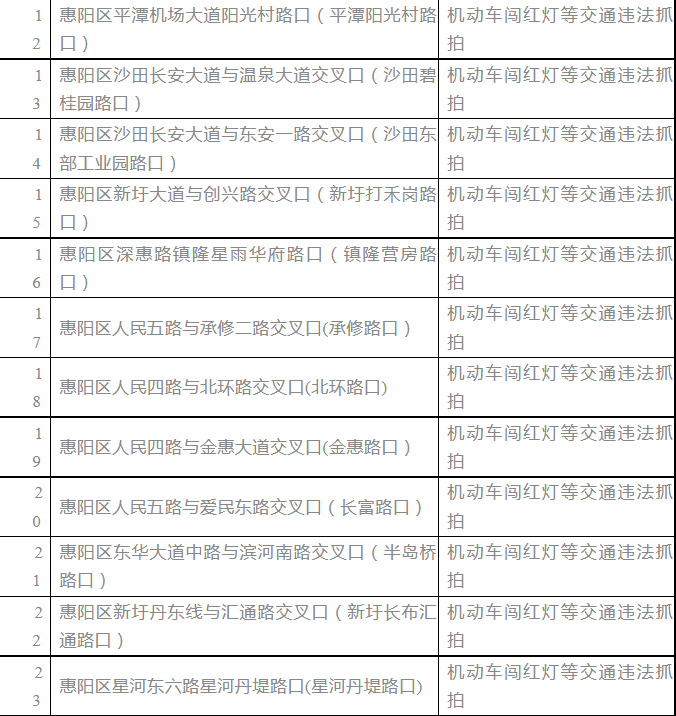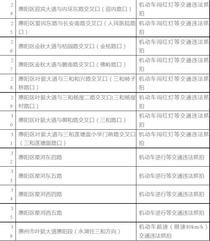 為加強(qiáng)惠陽(yáng)區(qū)道路交通管理,規(guī)范道路交通秩序,維護(hù)道路交通安全,預(yù)防和減少道路交通事故,惠陽(yáng)區(qū)交警部門準(zhǔn)備啟用(重啟)轄區(qū)36個(gè)點(diǎn)位交通技術(shù)監(jiān)控設(shè)備,為保證道路交通管理執(zhí)法規(guī)范、透明、公正,按照《道路交通安全違法行為處理程序規(guī)定》第十六條第二款“固定式交通技術(shù)監(jiān)控設(shè)備設(shè)置地點(diǎn)應(yīng)當(dāng)向社會(huì)公布”等有關(guān)規(guī)定,現(xiàn)將上述36處交通技術(shù)監(jiān)控設(shè)備所在位置予以公布,具體如下: