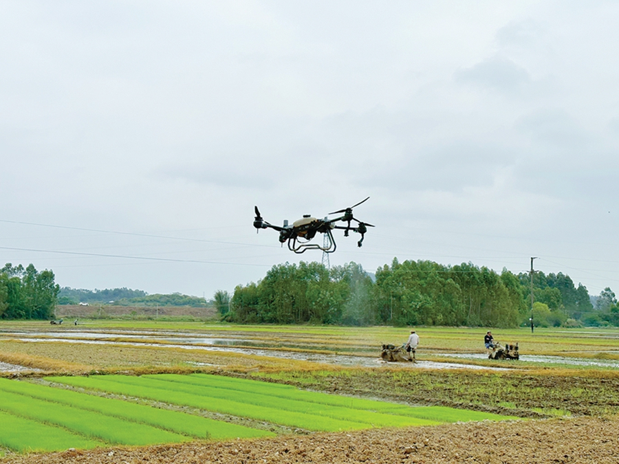 在新崗村,縱橫阡陌間可見農(nóng)民忙碌的身影,大家紛紛搶抓當前晴好天氣,奏響春耕“進行曲”。據(jù)介紹,這片農(nóng)田約1200畝,是惠陽區(qū)目前最大的連片水稻種植基地。記者看到,拖拉機、旋耕機在轟鳴聲中犁田、翻地,無人機在空中來回穿梭施肥。大片大片的水田旁邊,綠油油的水稻秧苗正等待移栽。秧苗安放在自動插秧機里,操作人員只需進行簡單設置和遙控啟動,插秧機便開始自動插秧作業(yè)。不一會兒,秧苗便在田間排出整齊的隊列。