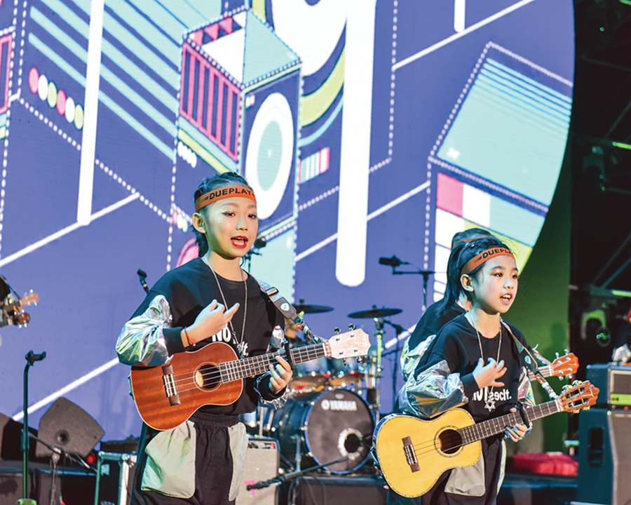 惠陽推動吉他制造業(yè)向文化、藝術(shù)、教育、工業(yè)旅游領(lǐng)域拓展延伸。這是孩子們在舞臺上進(jìn)行吉他彈奏。