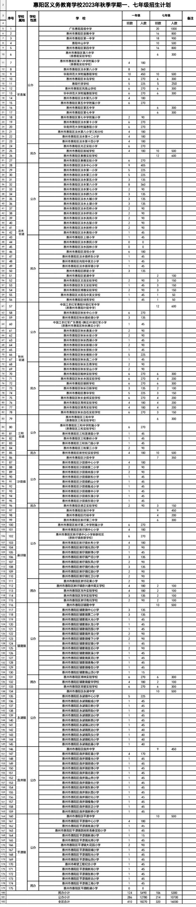 惠陽區(qū)義務教育學校2023年秋季學期一、七年級招生計劃