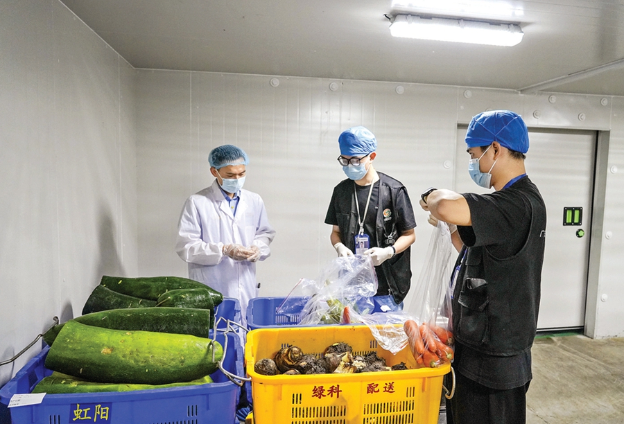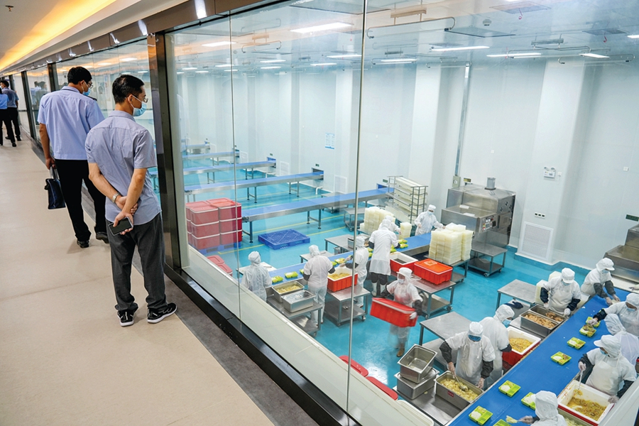 市場監(jiān)管執(zhí)法人員檢查配餐企業(yè)生產情況。