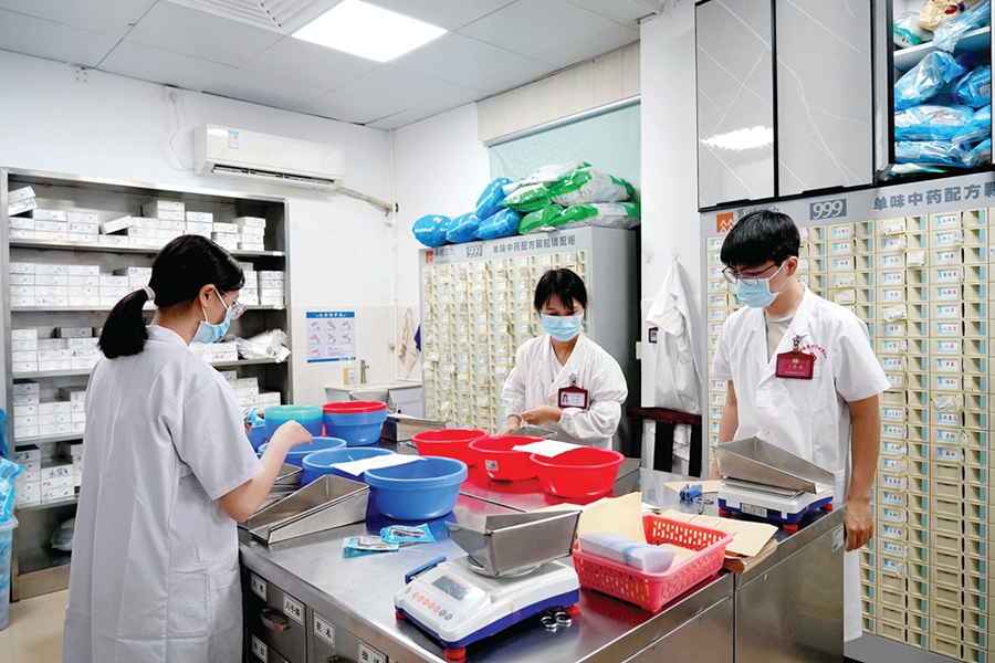 醫(yī)護(hù)人員正在中藥房按方抓藥。