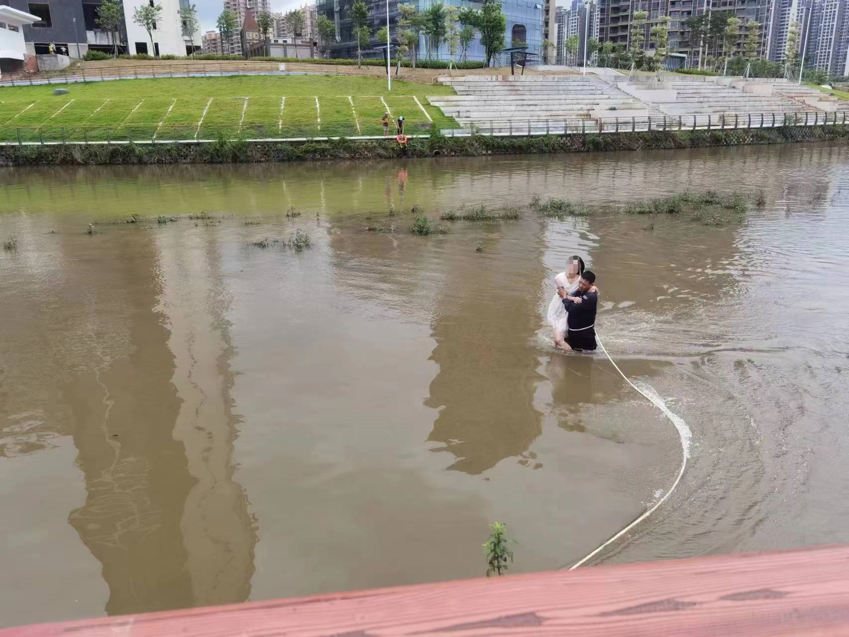 在呼喊女子毫無反應(yīng)時,隊員陳春敬立即找繩索套在自己的腰間,跳入河中,以最快的速度往女子方向靠近。