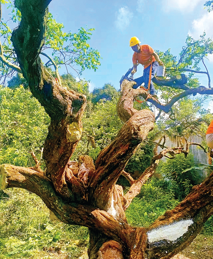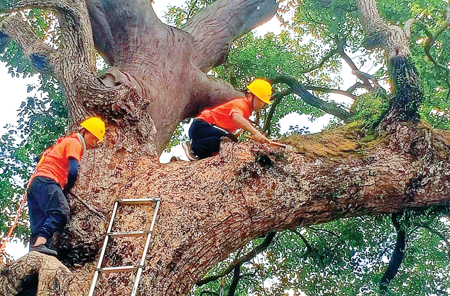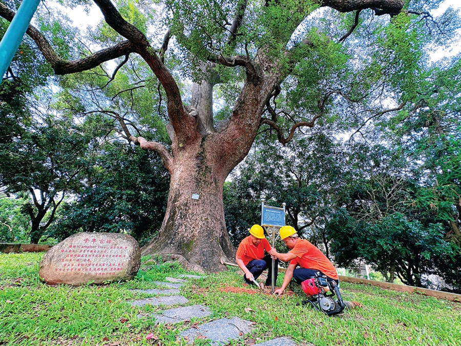 工人在古樹旁豎保護(hù)牌。 惠州日?qǐng)?bào)記者李芳娟 攝