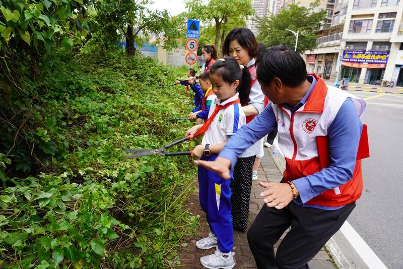 隨后,該校少先隊(duì)員代表及其家長、星河丹堤志愿服務(wù)隊(duì)等60人,在星河社區(qū)開展“綠美廣東 紅領(lǐng)巾在行動(dòng)”紅領(lǐng)巾親子護(hù)綠活動(dòng)暨紅領(lǐng)巾獎(jiǎng)?wù)聽幷禄顒?dòng)。在志愿者的帶領(lǐng)下,紅領(lǐng)巾親子家庭干勁十足地修剪綠化帶,展示少先隊(duì)員們參與“綠美廣東”行動(dòng)的決心。