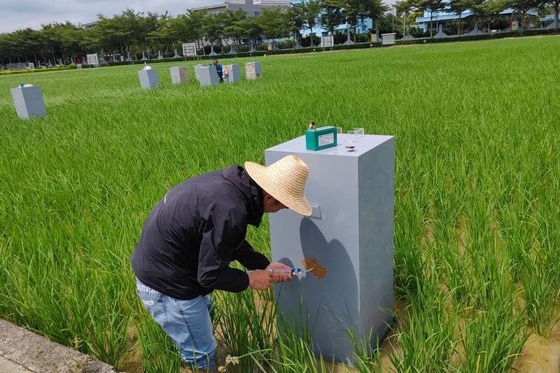在試驗(yàn)田里記者看到,每塊田上都放置著3個(gè)采氣箱。技術(shù)人員用針管收集每個(gè)采氣箱中的氣體,采集完畢后將氣體密封保存,并帶回實(shí)驗(yàn)室進(jìn)行氣體檢測(cè)和數(shù)據(jù)分析!拔覀兠扛10天從農(nóng)科院過(guò)來(lái)采集一次溫室氣體。這里的每個(gè)箱子里框著4棵水稻,每隔10分鐘采集一次氣體。主要是測(cè)量水稻排放的一些溫室氣體,甲烷、二氧化碳和氧化亞氮!笔∞r(nóng)科院農(nóng)業(yè)資源與環(huán)境研究所實(shí)驗(yàn)師周昌敏告訴記者,為提升數(shù)據(jù)的科學(xué)性和準(zhǔn)確性,該項(xiàng)目的研究和技術(shù)人員通過(guò)在每個(gè)田塊設(shè)置3個(gè)氣體采集點(diǎn),整個(gè)試驗(yàn)田共設(shè)置64個(gè)。