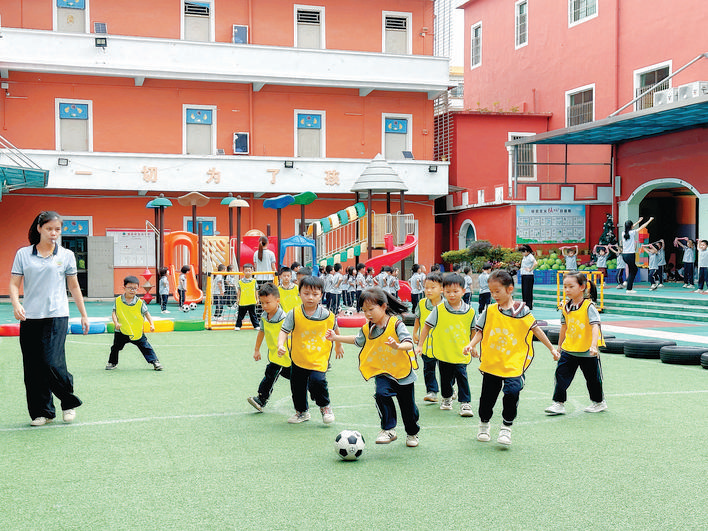 幼兒園里,孩子們在快樂地踢足球。 惠州日報記者李芳娟 攝