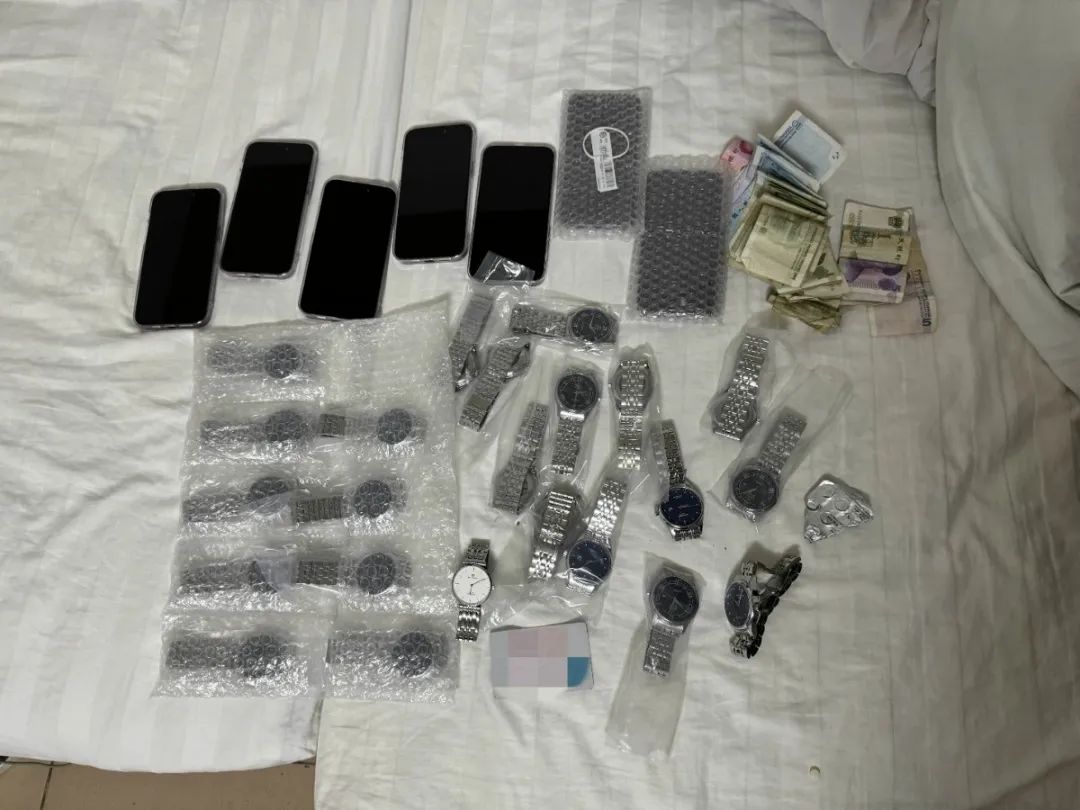 11月17日下午,辦案民警在秋長街道秋南秋寶路一家賓館內(nèi)抓獲犯罪嫌疑人姜某等8人,現(xiàn)場收繳高仿手機(jī)15部、假名牌手表24塊。