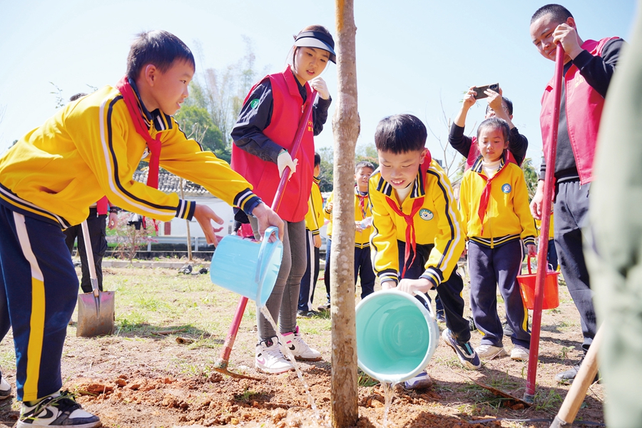 孩子們踴躍提水澆灌樹(shù)木,十分開(kāi)心。