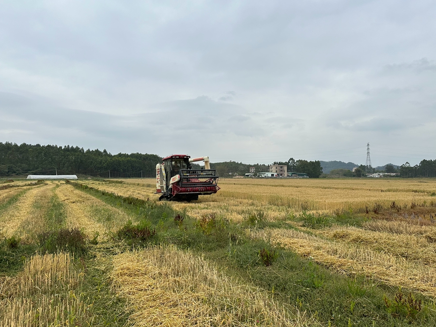 眼下正值春耕春播時(shí)節(jié),位于惠陽區(qū)平潭鎮(zhèn)新崗村的惠陽區(qū)最大連片糧食主產(chǎn)區(qū)(600畝)內(nèi),一邊是春耕繁忙播種希望的景象,一邊是收割機(jī)響起、收割冬小麥的豐收景象。這里50畝冬小麥?zhǔn)切聧彺宕迕顸S惠南為響應(yīng)國家“雙季稻+”輪作號召而首次嘗試種植的。