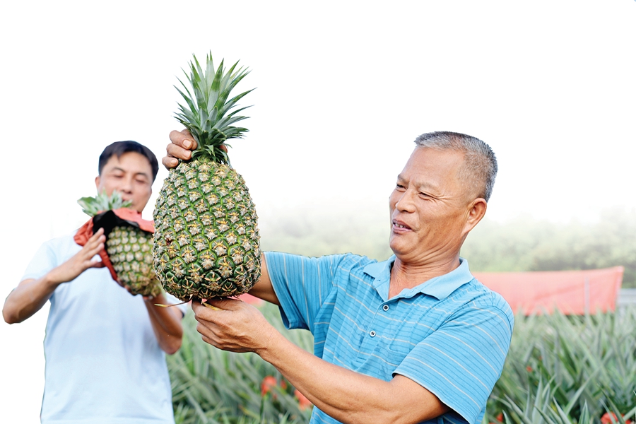 樓角村村道兩旁,一排排整齊的鳳梨長勢喜人,沁人心脾的果香隨風飄散,一顆顆個頭飽滿的鳳梨“端坐”在叢叢葉片中。斜坡上、菜園子旁,隨處可見村民們種植的鳳梨。偶遇在村道上玩耍的孩子,他們會熱情詢問:“你們要摘鳳梨嗎?”