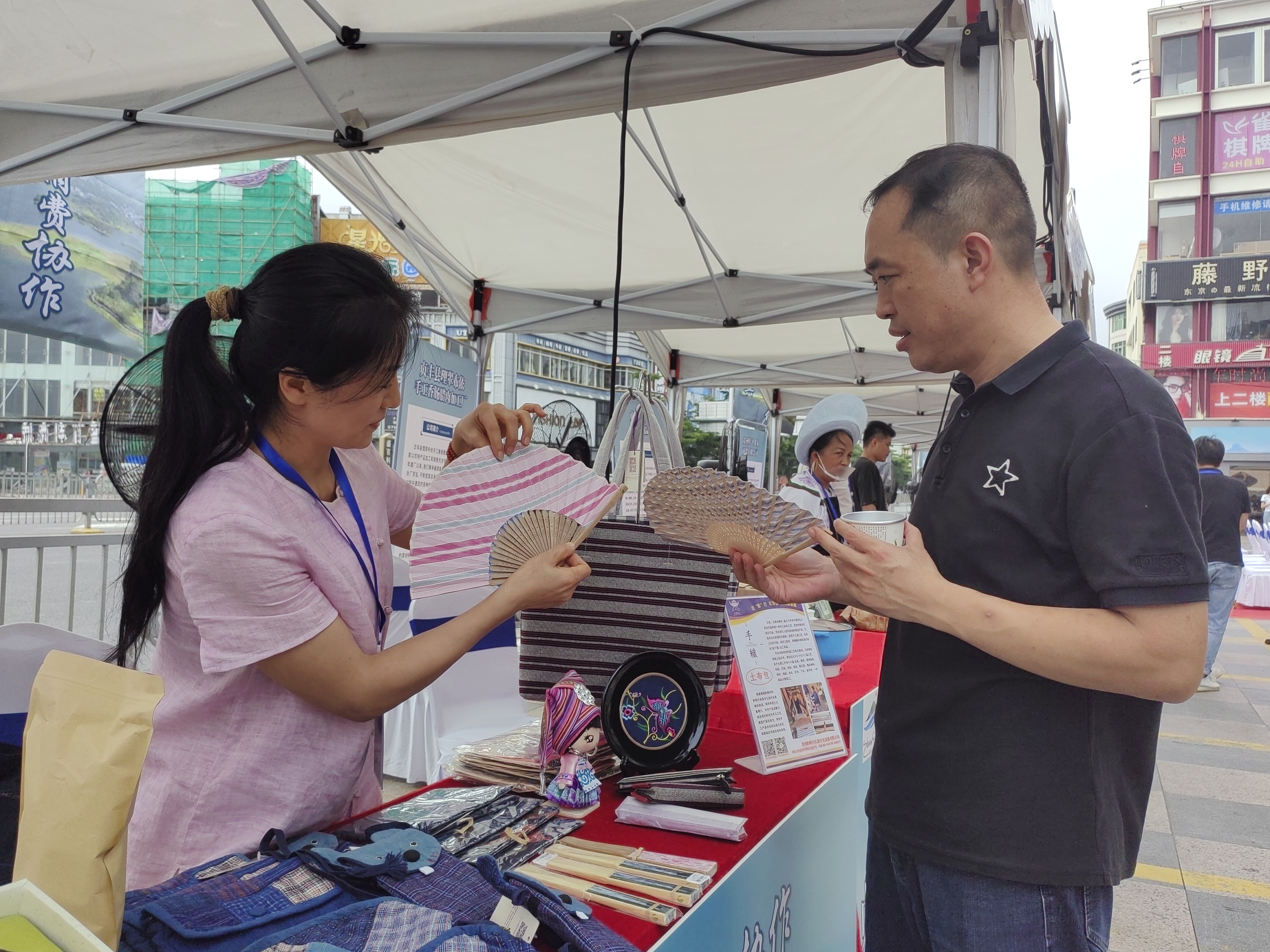 “我們這次帶來的是茶葉以及手工藝品,這個(gè)手工藝品是土布,全部手工制作,是民族與時(shí)尚的結(jié)合!薄拔覀兊脑嘛灷锛尤肓嘶ń泛碗缰频娜,口感獨(dú)特、風(fēng)味絕佳,是貞豐獨(dú)有的美味!闭逛N會現(xiàn)場人頭攢動(dòng),熱鬧非凡。商家不遺余力地向惠陽市民推薦自家的特色產(chǎn)品。從傳統(tǒng)的布依灰粽、香氣四溢的糯米飯,到創(chuàng)新融合的花椒腌肉月餅、醇厚的醬酒,再到清新雅致的茶葉、營養(yǎng)豐富的食用菌和堅(jiān)果,每一款產(chǎn)品都承載著貞豐人民的辛勤勞動(dòng)與智慧,展現(xiàn)了貞豐縣豐富的農(nóng)業(yè)資源和獨(dú)特的飲食文化。