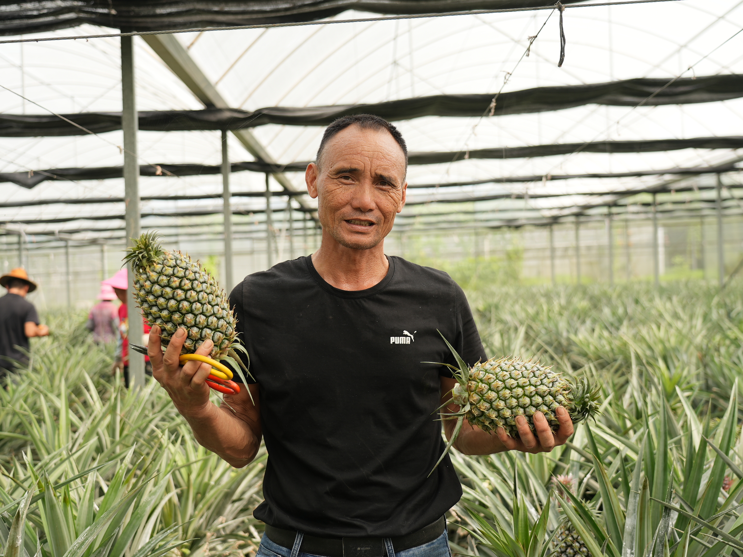 走進(jìn)亞維濃生態(tài)園鳳梨種植大棚,眼前一片郁郁蔥蔥,一顆顆鳳梨從層層葉片中冒出頭來,個頭飽滿。工人們錯落分散在大棚里,忙著采收,一派豐收景象。