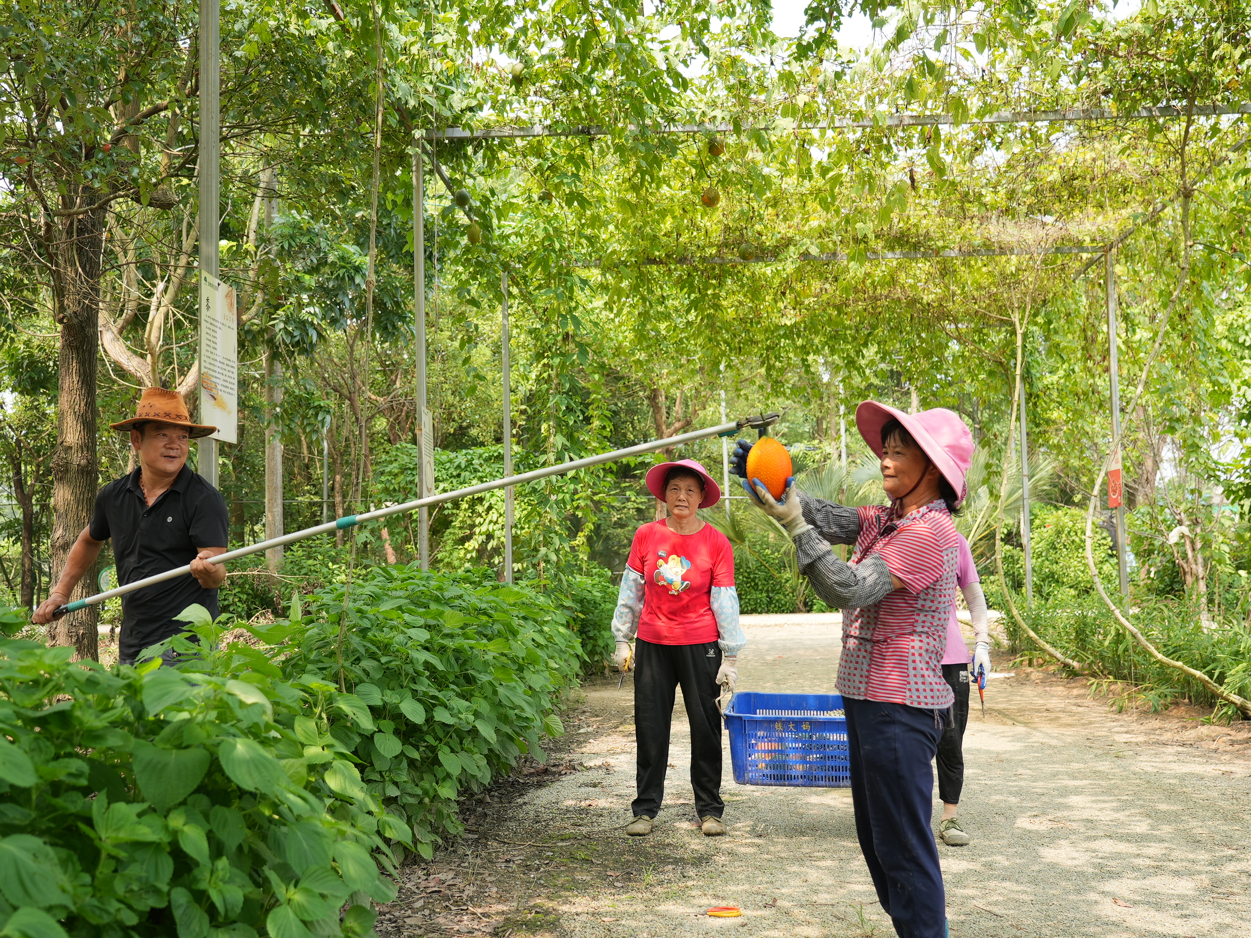 今年55歲的陳玉梅戴著帽子、袖套,拿著剪刀嫻熟地采收各類水果。她家住惠陽區(qū)良井鎮(zhèn),離生態(tài)園很近,每天都會從家騎車過來幫忙采摘蔬果。“這份工作做得很開心!既能照顧老人、小孩和家庭,又有一份穩(wěn)定的收入,一年下來能有近5萬元!