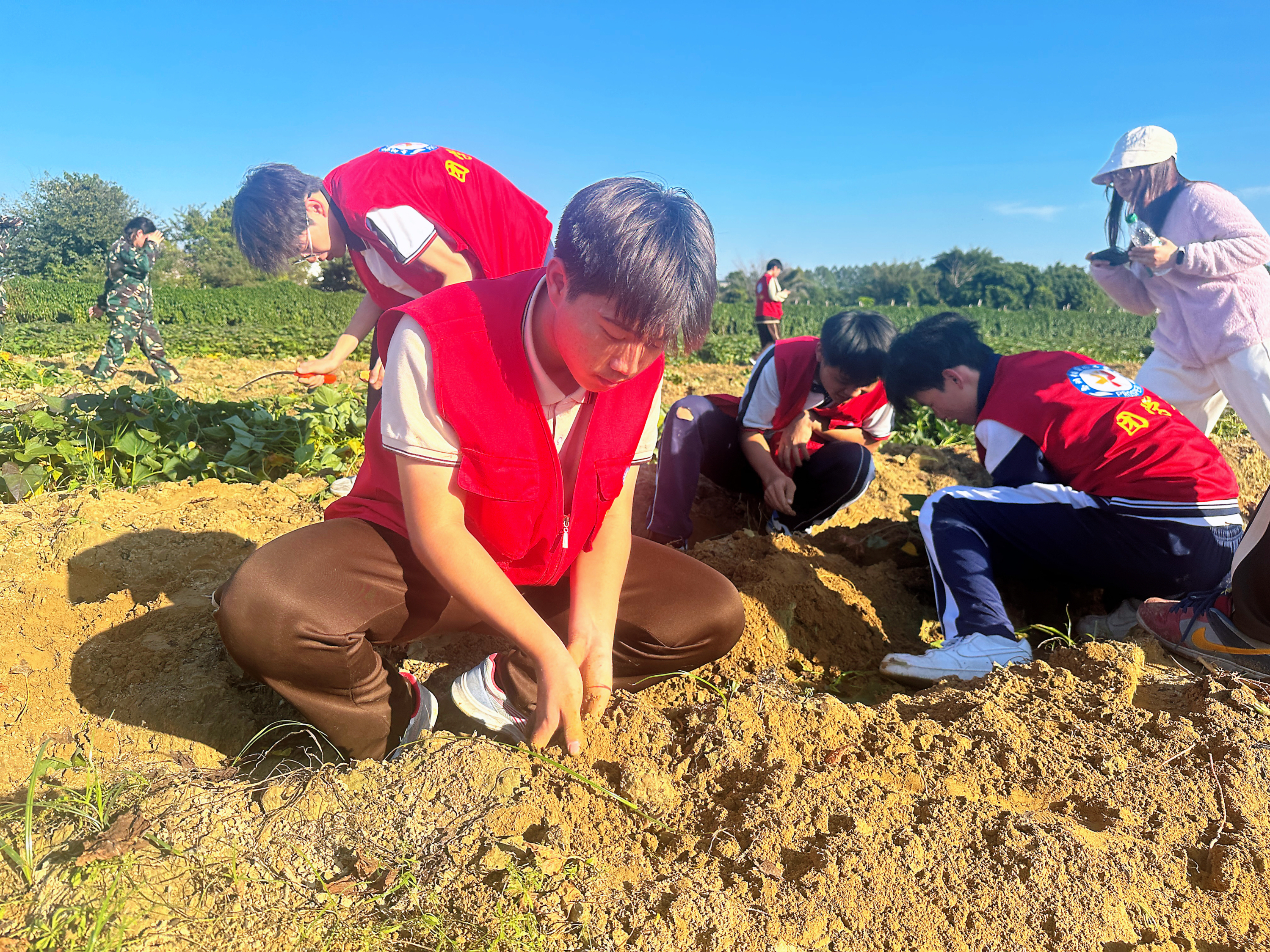 淮山農(nóng)業(yè)公園的紅薯地眼下正迎來(lái)收獲季!暗搅思t薯收獲時(shí)節(jié),得知該村人手緊張、農(nóng)活繁重,結(jié)合學(xué)!凶叩乃颊n’,我們組織黨員、團(tuán)員開(kāi)展了這場(chǎng)志愿活動(dòng)!被葜菔胁┵惣脊W(xué)校黨支部副書(shū)記、校長(zhǎng)助理陳妙玲介紹,這場(chǎng)別樣的思政課在發(fā)起時(shí)就得到大家踴躍支持。