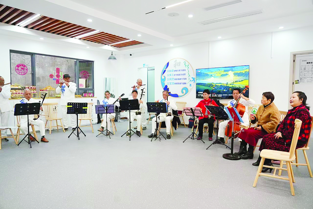 老年人樂(lè)隊(duì)在新圩鎮(zhèn)長(zhǎng)布村活動(dòng)中心排練;葜萑?qǐng)?bào)記者許文昌 攝