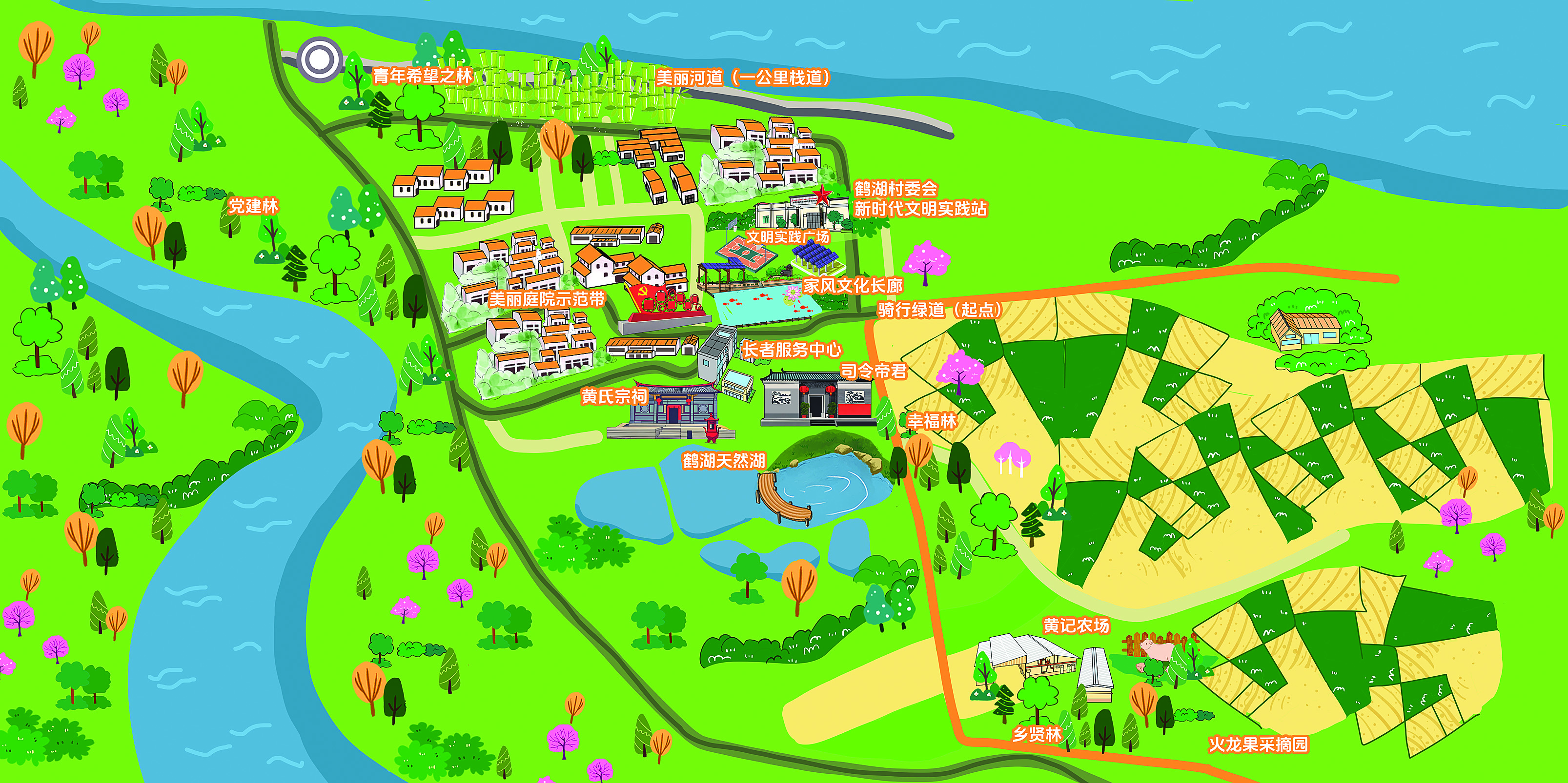 “通過打造,我們的村莊越來越美了!柄Q湖村黨總支書記徐冠嶺表示,村莊以“記得住鄉(xiāng)愁”為發(fā)展定位。日前,該村發(fā)布首張農(nóng)文旅路線圖,上面詳細標注青年希望之林、美麗庭院示范帶、家風(fēng)文化長廊、文明廣場、騎行道、鶴湖天然湖、黃氏宗祠、賢林、采摘園等地方,為游客勾勒出一幅“按圖索驥”的鄉(xiāng)村游玩指南。這也標志著鶴湖村農(nóng)文旅融合邁入新階段。