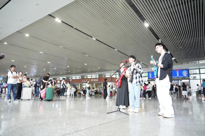 “我的世界,因?yàn)橛心悴艜?huì)美……”隨著《最美的太陽》旋律響起,樂隊(duì)主唱顧小鵝懷抱木吉他從人群中走出,身后樂隊(duì)成員以電吉他與節(jié)奏箱鼓即興伴奏,激昂的掃弦聲與振奮人心的歌詞交織在一起,剎那間點(diǎn)燃了整個(gè)現(xiàn)場(chǎng)的氣氛。表演者們穿梭于站前廣場(chǎng)和候車區(qū),將《追夢(mèng)赤子心》《海闊天空》等曲目用指尖流淌的吉他音符傳遞給在場(chǎng)的乘客,高鐵站場(chǎng)瞬間化作“露天音樂廳”。