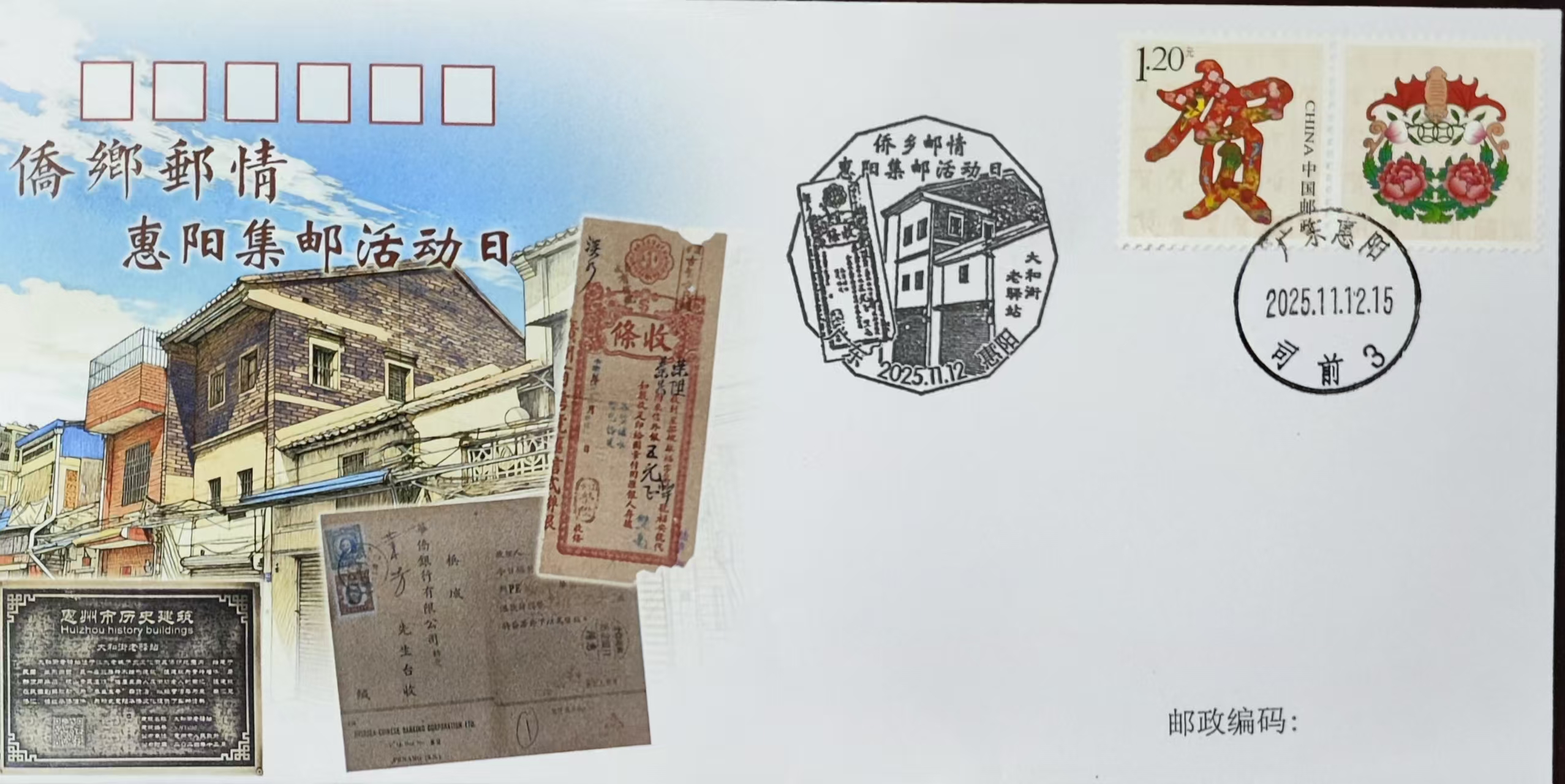 當(dāng)天“僑鄉(xiāng)郵情——惠陽(yáng)集郵活動(dòng)日”專(zhuān)屬紀(jì)念封與紀(jì)念戳發(fā)布。這套精心策劃的郵品特邀設(shè)計(jì)師高峰執(zhí)筆,巧妙融合淡水老城大和街老驛站、惠陽(yáng)僑批封、惠陽(yáng)市文物保護(hù)鐵牌等標(biāo)志性元素,于方寸之間生動(dòng)勾勒出惠陽(yáng)深厚的歷史底蘊(yùn),定格華僑文化的獨(dú)特印記,成為傳遞鄉(xiāng)情記憶、聯(lián)結(jié)海內(nèi)外鄉(xiāng)親的“文化名片”。
