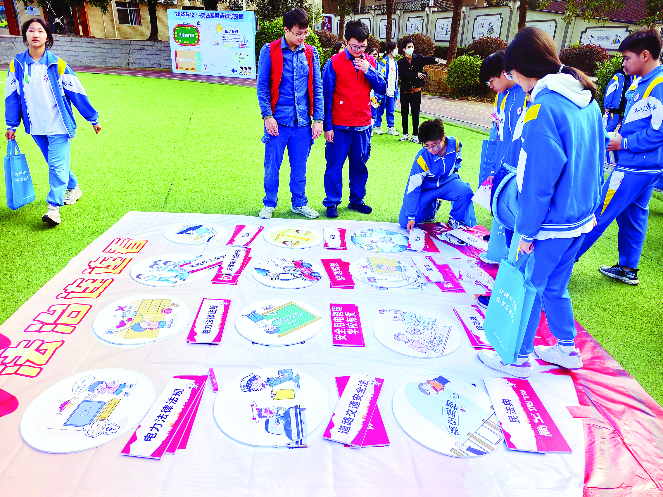 同步開(kāi)展的法治游園活動(dòng)設(shè)置六大特色區(qū)域,讓普法更具趣味性與體驗(yàn)感:法治文化觀覽區(qū)集中展示習(xí)近平法治思想、百年法律大事記、反學(xué)生欺凌等內(nèi)容;法治講座區(qū)開(kāi)展《憲法在我心 青春伴法行》專題宣講;模擬法庭區(qū)以《向?qū)W生欺凌說(shuō)“不”》為主題,通過(guò)侵權(quán)民事糾紛模擬庭審,讓參與者沉浸式感受法律威嚴(yán);法治體驗(yàn)區(qū)開(kāi)放公檢法物品展示,涵蓋法槌、檢徽、警用器械等實(shí)物觀摩,還普及了禁毒及辨別“上頭電子煙”等實(shí)用知識(shí);趣味法治游戲區(qū)設(shè)置法律知識(shí)問(wèn)答、法治拼圖等互動(dòng)游戲;法律知識(shí)咨詢區(qū)則提供專業(yè)法律與心理咨詢服務(wù)。