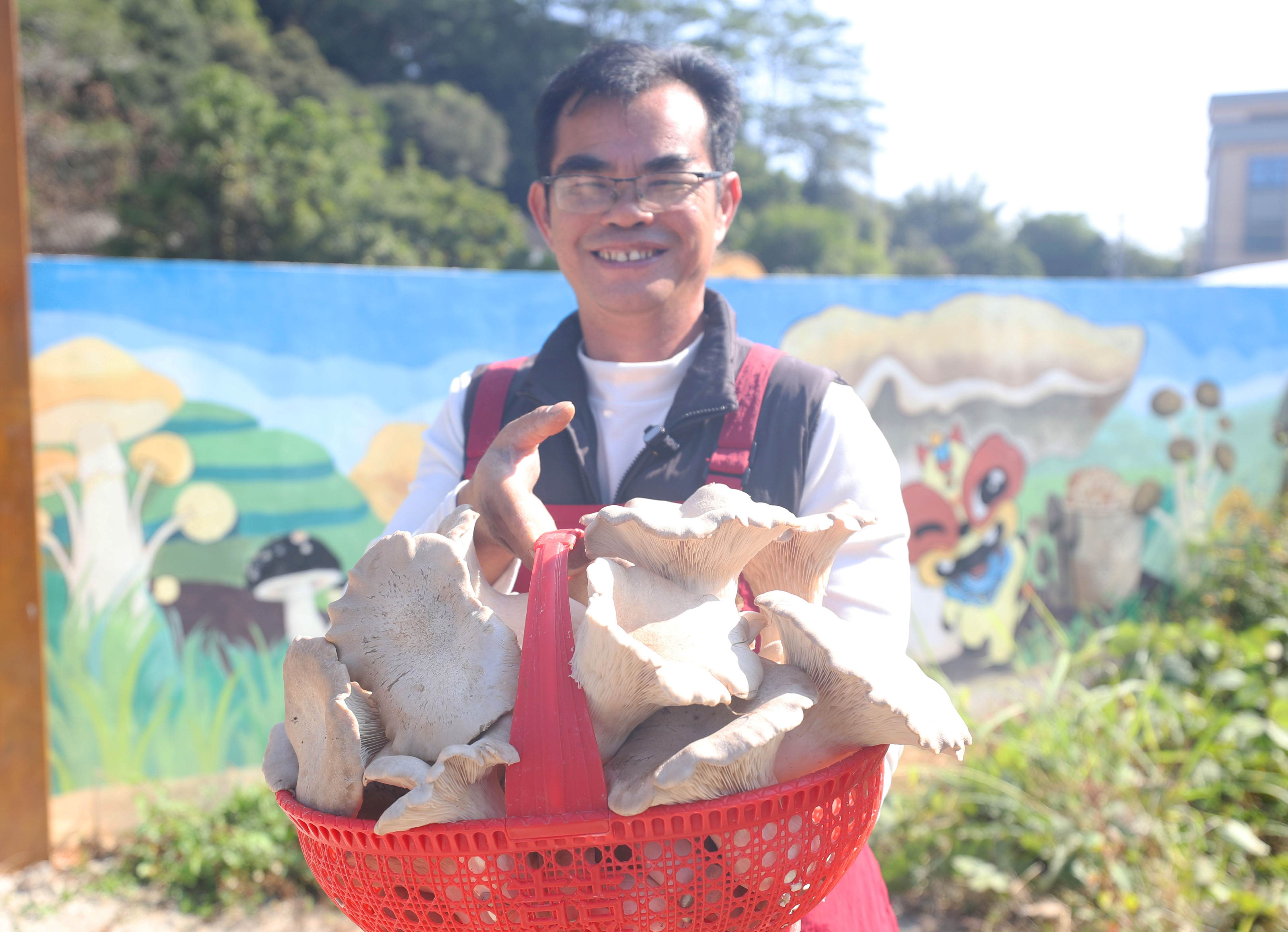 食用菌技術(shù)員陳岸雄展示剛采摘的麒麟菇。