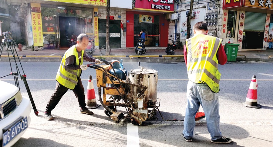 工作人員正在翻新停車(chē)位標(biāo)線(xiàn)。 惠州日?qǐng)?bào)記者黃宇翔 通訊員龍融心 攝