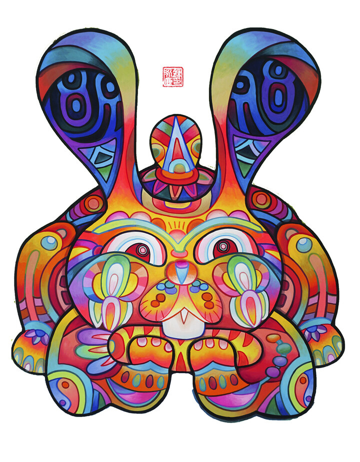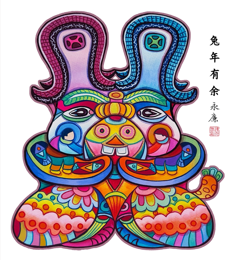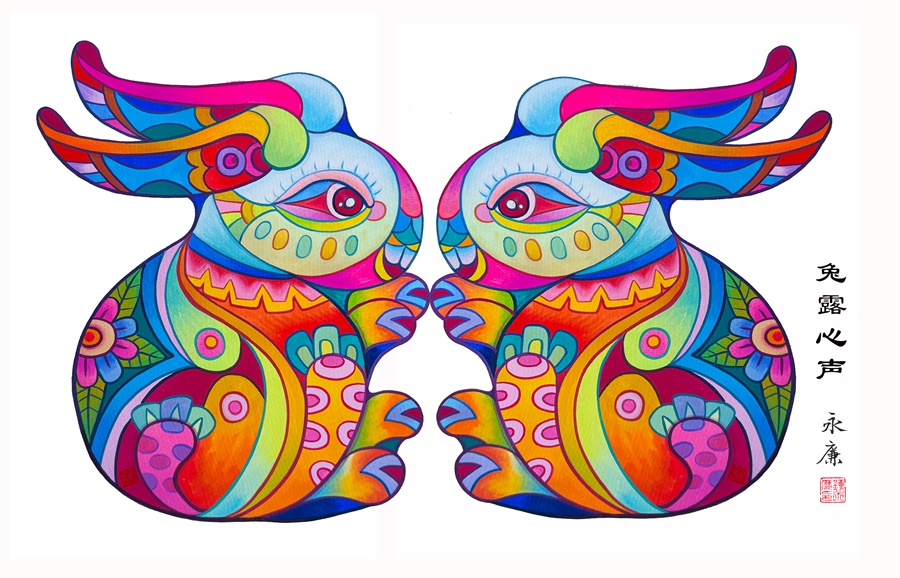卯兔位列十二生肖之四,“卯”代表春意,代表黎明,充滿無限生機,“兔”的諧音則有揚眉吐(兔)氣、前途(兔)似錦、大展宏圖(兔)等,蘊含美好寓意。85后畫家鐘永廉創(chuàng)作的《瑞兔呈祥賀新年》系列作品,包括《兔氣揚眉》《兔年有余》《兔露心聲》《瑤兔獻瑞》《I love you 兔》等,傳統(tǒng)與現(xiàn)代結(jié)合,色彩鮮艷,造型生動,展現(xiàn)對生活美好的祝愿。