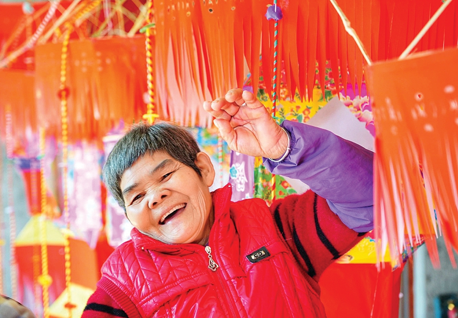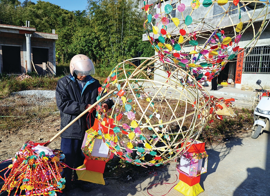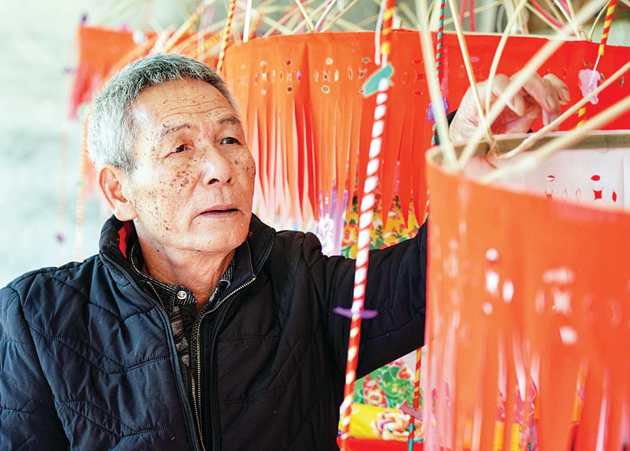 何廖福還告訴記者,他七歲開始跟爺爺學做花燈,虎頭花燈以竹、紙為主要材料,它的制作過程主要包括扎架、剪紙、卷燈帶、裱糊、做燈斗與鳳雞等。