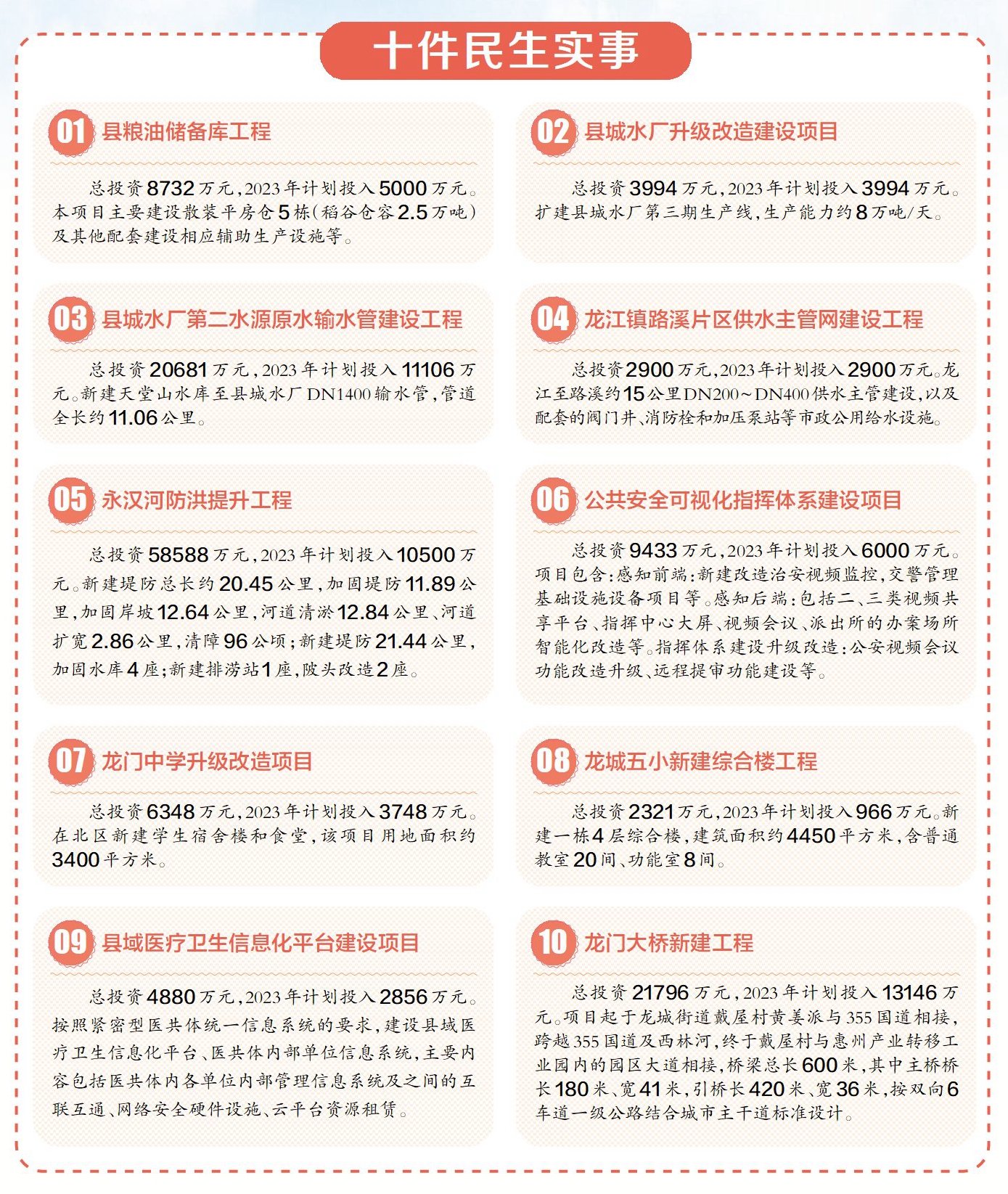 為進(jìn)一步增進(jìn)民生福祉,解決群眾急難愁盼問(wèn)題,使惠民實(shí)事更貼近群眾心愿,早前,根據(jù)龍門縣委、縣政府工作安排,按照“注重民生、量力而行、兌現(xiàn)承諾、當(dāng)年見(jiàn)效”的原則,龍門縣政府初步遴選出2023年縣級(jí)民生實(shí)事,整理形成《龍門縣2023年民生實(shí)事候選項(xiàng)目表》。近日,龍門縣十六屆人大四次會(huì)議上票選并公布了2023年龍門縣十件民生實(shí)事。十件民生實(shí)事涵蓋飲水、教育、醫(yī)療、交通、安全等多個(gè)領(lǐng)域,將進(jìn)一步增進(jìn)龍門群眾民生福祉、提升群眾幸福感。