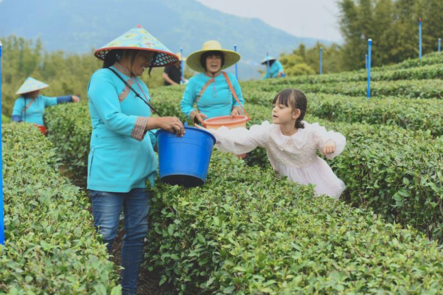 外國(guó)小朋友與茶農(nóng)一道體驗(yàn)采茶樂(lè)趣。
