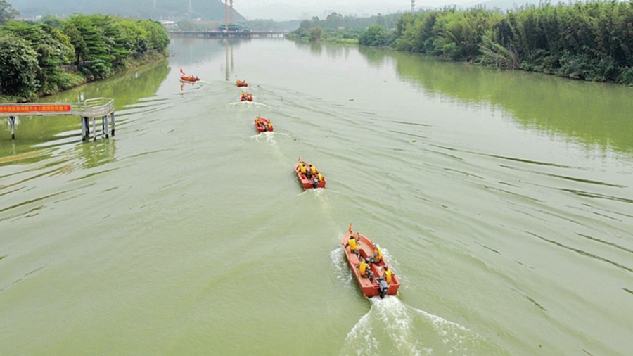 應(yīng)急救援隊(duì)伍乘坐沖鋒舟在水域上快速行進(jìn)。 惠州日?qǐng)?bào)記者黃宇翔 通訊員龍融心 攝