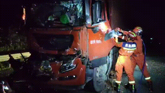 消防救援人員抵達(dá)現(xiàn)場后發(fā)現(xiàn),后車一名駕駛員被困,強烈的撞擊導(dǎo)致后車車頭嚴(yán)重變形,駕駛員被變形的車體牢牢卡住無法移動。掌握現(xiàn)場情況后,消防救援人員使用液壓擴張器,對貨車左側(cè)車門進(jìn)行擴張。