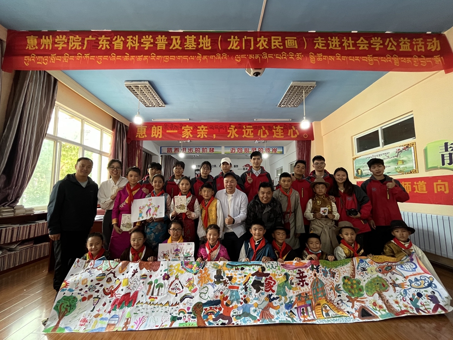 惠州學(xué)院廣東省社會(huì)科學(xué)普及基地(龍門(mén)農(nóng)民畫(huà))公益活動(dòng)日前在西藏林芝市朗縣中心小學(xué)舉行,舉辦了“漢藏一家親,攜手繪長(zhǎng)卷”“漢藏同源茶畫(huà)會(huì)”和漢藏非遺故事繪等活動(dòng),架起一座連接漢藏友誼的藝術(shù)橋梁。這是“廣東文化名片”龍門(mén)農(nóng)民畫(huà)首次走進(jìn)西藏交流展示。此次活動(dòng)由惠州學(xué)院第十二批援藏支教師生組織開(kāi)展,惠州學(xué)院美術(shù)與設(shè)計(jì)學(xué)院副院長(zhǎng)吳冠聰、教師陳瑞綺和龍門(mén)農(nóng)民畫(huà)傳承人、美育導(dǎo)師鐘永廉帶領(lǐng)支教學(xué)生共同參與。