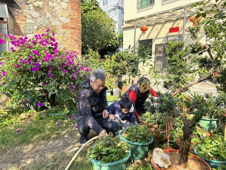 莫水潤與家人打理庭院里的綠植。 本組圖片 惠州日報(bào)記者黃宇翔 通訊員龍融心 攝
