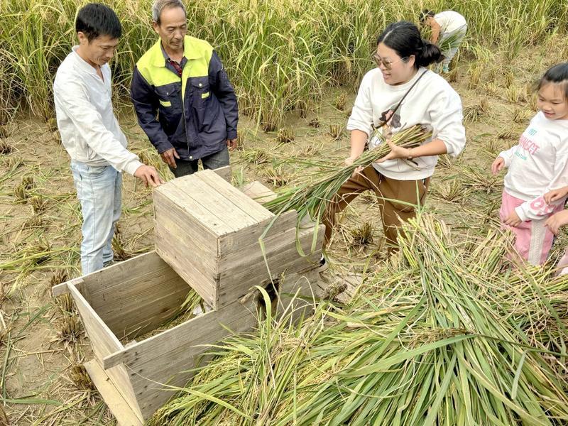 家長(zhǎng)帶著孩子到田里體驗(yàn)收割“巨型稻”;葜萑?qǐng)?bào)記者黃宇翔 通訊員龍融心 攝