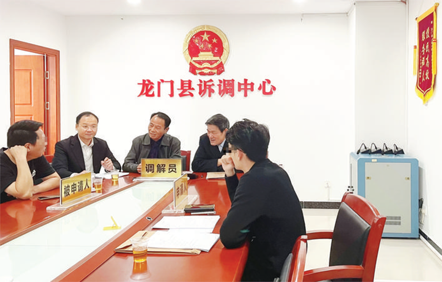 龍門法院新楓橋工作室特聘調(diào)解員正在調(diào)解糾紛。